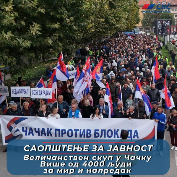 Драги Чачани, велико хвала што смо заједно још једном показали културу, достојанство и демократски капацитет нашег града. Доказали смо да је могуће окупљати се у великом броју и на пристојан начин без угрожавања било кога исказати став и властито мишљење. Преко 4000 Чачана на две локације, у центру нашег града и у селу Заблаће, пружило је подршку нормалном животу, миру и напретку уз неговање политичког дијалога и међусобног уважавања, без иједне увреде или ружне речи.